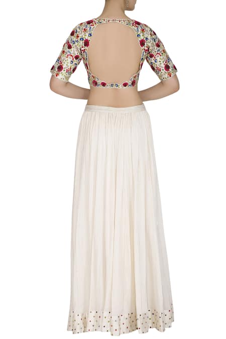 Ivory blouse with all over floral motif embroidery. Comes with crinkled textured lehenga & dupatta.