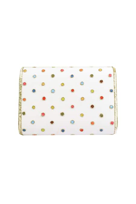 White flap clutch featuring all-over multi-color polka dot motif thread work and bead danglings