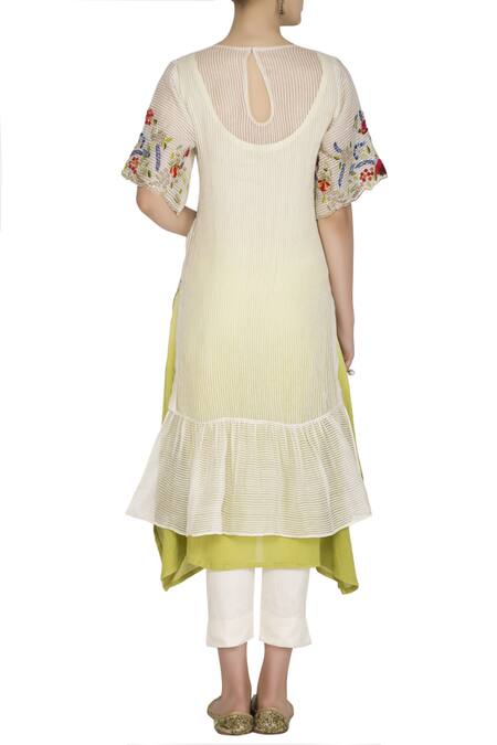 Ivory kurta with multi color embroidered motifs & ruffled hem. Comes with ombre inner kurta & straight pants.