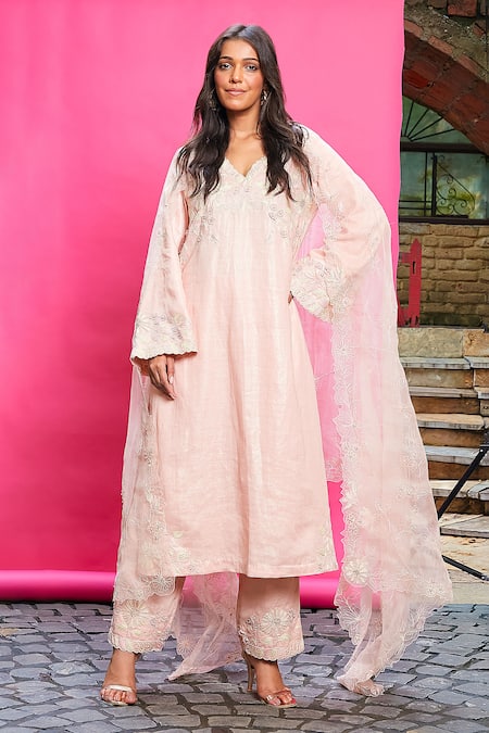 Peach Cotton, Linen Embroidery V-neck Floral Bloom Kurta Pant Set