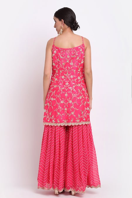 Fuchsia kurta with cutdana, sequin and beads embroidery. Comes with sharara and dupatta.