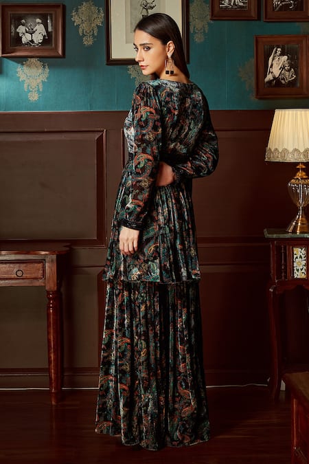 Black Velvet Lining Shantoon Paisley Print And Cutdana Peplum Kurta Sharara Set