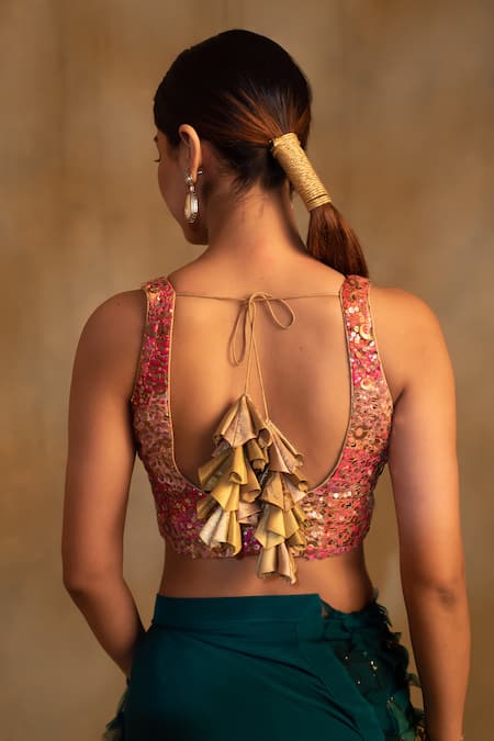 Unique back tie-up with decorative tassels, Zero waste philosophy in design, Hand embroidered sequins clusters across the fabric