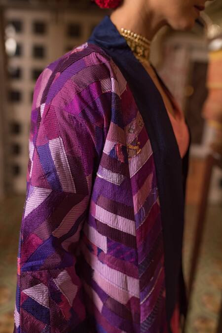Buy_Priyanka Raajiv_Purple Silk, Satin, Brocade, Cotton And Chakori Chevron Pattern Patch Jacket _Online_at_Aza_Fashions