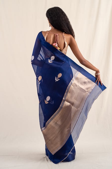Blue silk Banarasi saree featuring handwoven floral buttis and a solid border. Comes with an unstitched blouse piece.