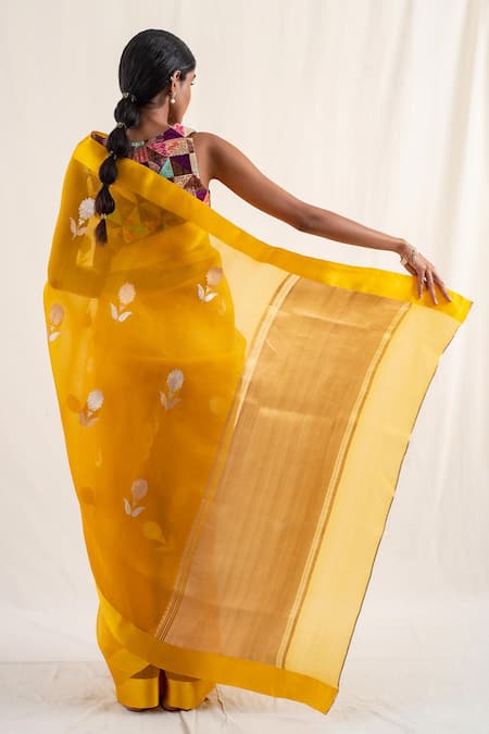 Yellow silk Banarasi saree featuring gold floral buttis and a solid border. Comes with an unstitched blouse piece.
