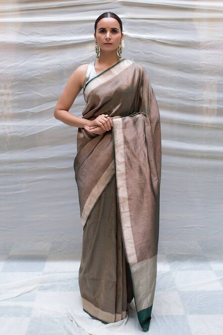 Green silk tissue brocade saree with stripe pattern border & pallu. Comes with running blouse.