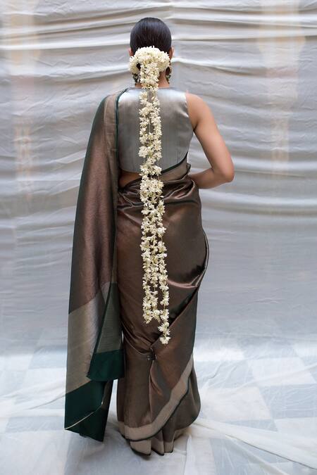 Green Silk Tissue Stripe Pattern Chunika Brocade Saree