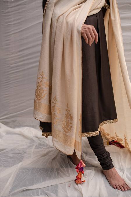Ivory Moonga Silk Floral Pattern And Multi Color Brocade Tassels Ganga Dupatta
