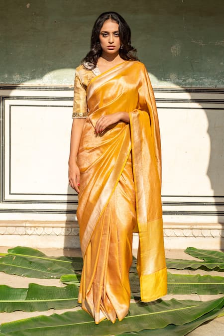 Yellow silk chanderi saree featuring textured border with woven motifs. Comes with a running blouse piece.