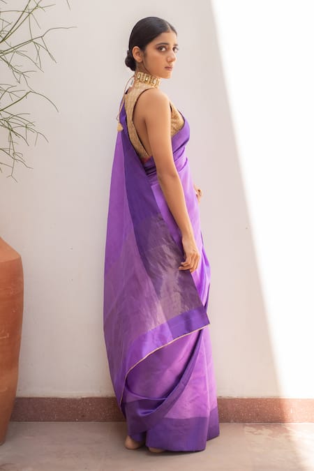Purple silk chanderi saree featuring a gold pallu stripe woven border. Comes with a running blouse piece.