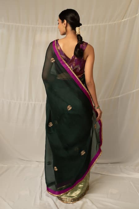 A deep forest green silk organza saree features hand-embroidered zardozi floral butis, complemented by a kiran border.