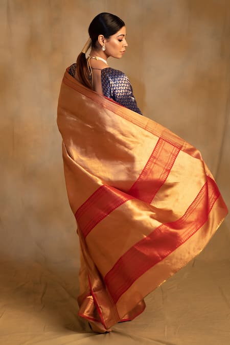 Gold saree featuring taraaz weave in silk chanderi fabric. Paired with an unstitched blouse piece.