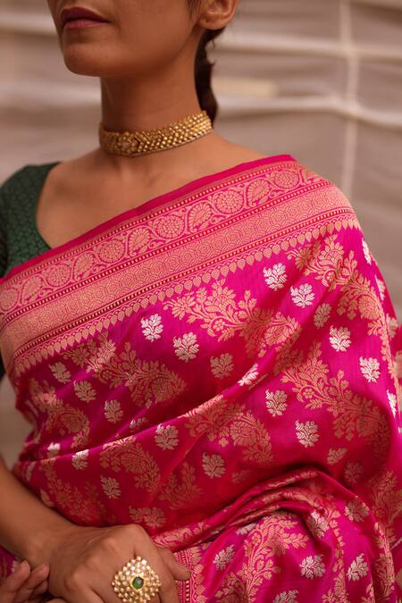 Pink saree with floral, paisley banarasi woven motifs & gold border. Comes with running blouse piece.
