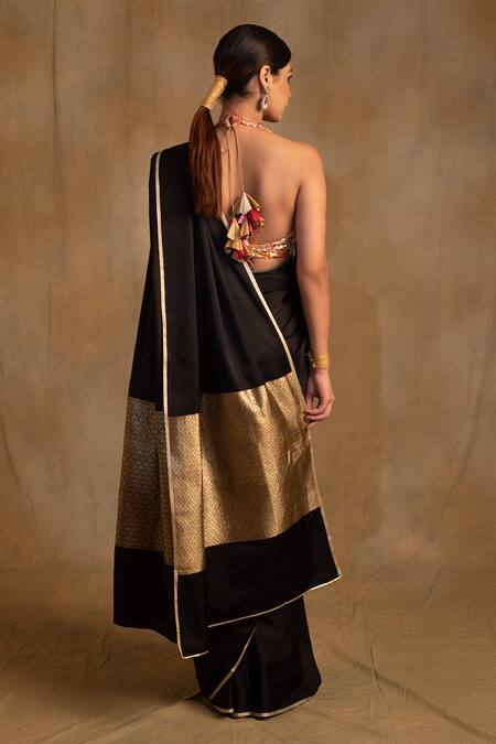 Black Banarasi Mashru saree featuring mashru geometric detailing on the pallu. Comes with an unstitched blouse piece.