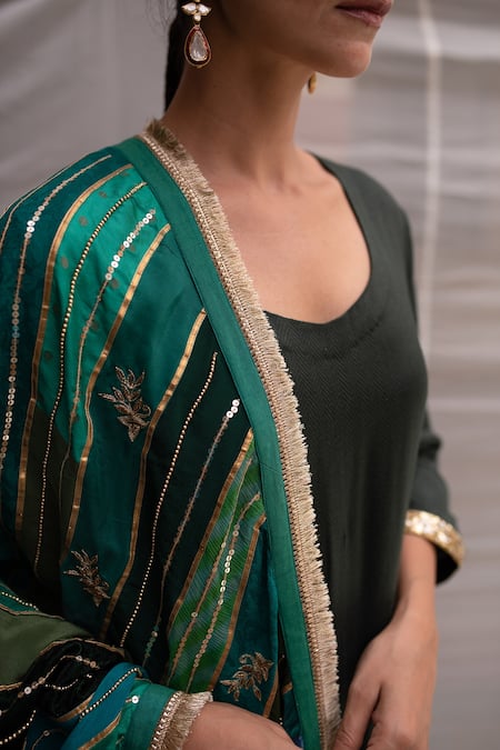 Green, blue dupatta with patchwork, gota, zardozi, sequin embroidery & tassel fringe border.