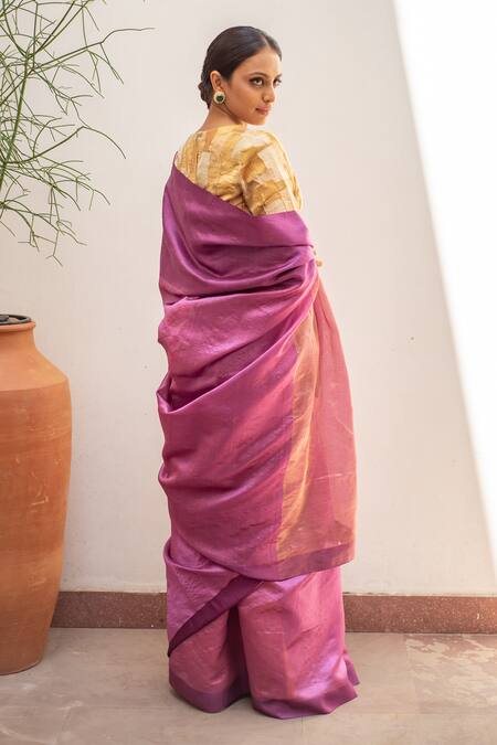 Buy_Priyanka Raajiv_Purple , Satin Mika Woven Bordered Saree With Running Blouse_at_Aza_Fashions
