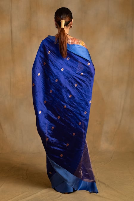 Handcrafted meenakari floral butis, Cobalt blue mashru border, Gold palla detailing