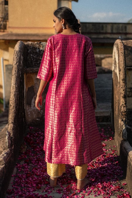 Pink kurta featuring a V neck, three quarter sleeves, and floral geometric woven patterns. Paired with sand yellow palazzo showcasing a Moroccan pattern.