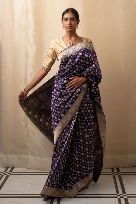 Indigo silk Banarasi saree featuring paisley floral buttis. Paired with a running blouse piece.