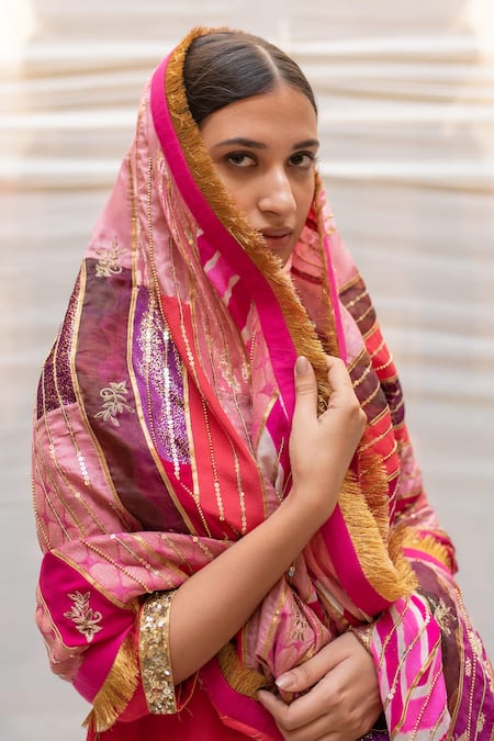 Multicolor patchwork dupatta with embroidered, printed fabric, gotapatti and handwoven silk lined border.