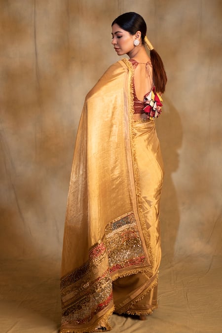 Gold silk tissue saree featuring handcrafted upcycled palla with zardozi borders and kiran finish. Comes with an unstitched blouse piece.