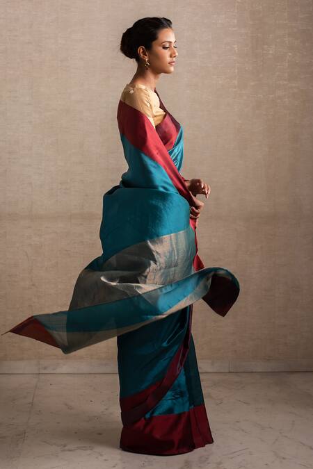 Teal saree with burgundy borders and gold pallu. Comes with unstitched blouse fabric.