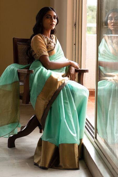 Aquamarine silk chanderi saree with gold border and pallu. Comes with unstitched blouse fabric.