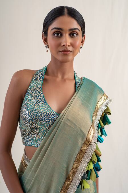 Green silk chanderi saree featuring multi-colored tasseled detailing and zari work on the border. It comes with an unstitched blouse piece.