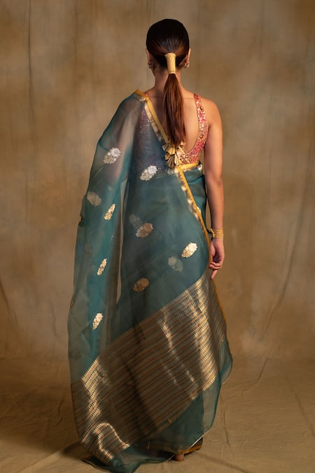 Teal blue silk organza saree featuring vintage gold paisley buti and thin gold border. Comes with an unstitched blouse piece.