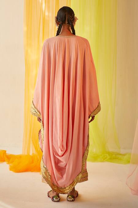 Peach cotton cowl kurta in sequin and zardozi work. Paired with an embroidered hem pant.