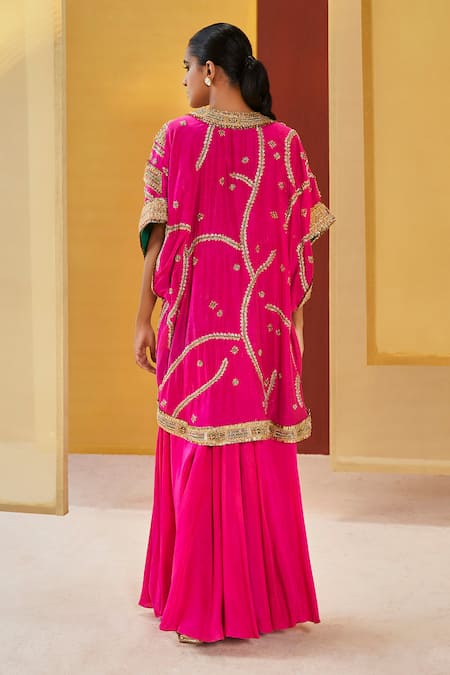 Fuchsia dupion silk cape featuring gota, fusion thread, and zardosi embroidery. Paired with a draped sharara pant and a net blouse.