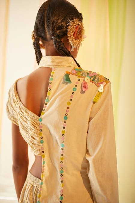 Off white cotton floral embroidered half shirt with one side pleated crop top. Paired with shimmer pant.