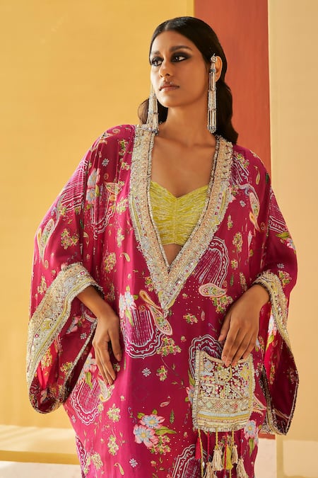 Pink kaftan featuring a deep V neck, flared sleeves, and all-over floral print. Paired with coordinating floral print joggers and a lime green bustier.