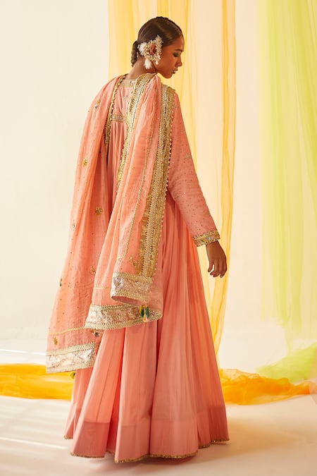 Peach Mul Silk Gota Work, Mukaish Work, Sequins, Zardozi Angrakha Sharara Set