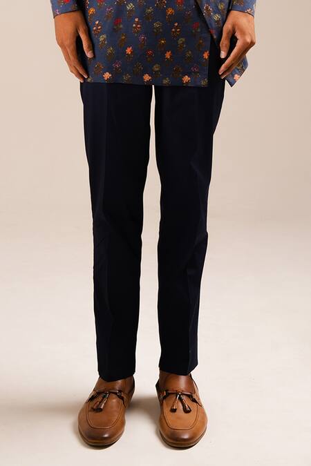 Navy blue kurta featuring a floral print with a closed round neckline and full sleeves. Paired with a plain ivory pant for a complete look.