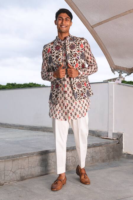White Nehru jacket with multi-color wild flowers printed motifs, chest pocket, two seam side pockets & gold-tone buttons.