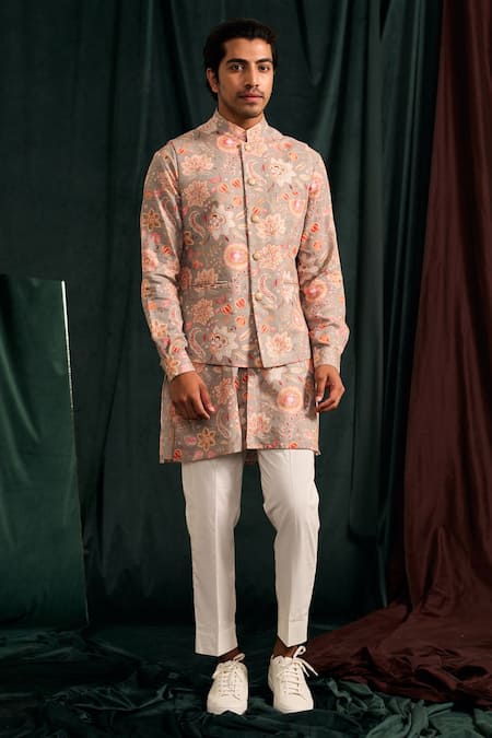 Grey floral printed bundi featuring front buttons and slit pocket. Paired with a matching kurta and pyjama, both in floral motifs with a mandarin collar.