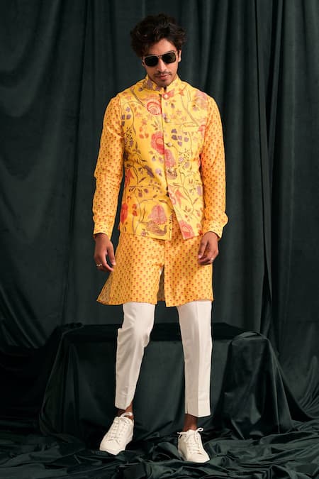 Yellow floral printed bundi with a mandarin collar and front button closure. Paired with a coordinating floral printed kurta and pyjama.