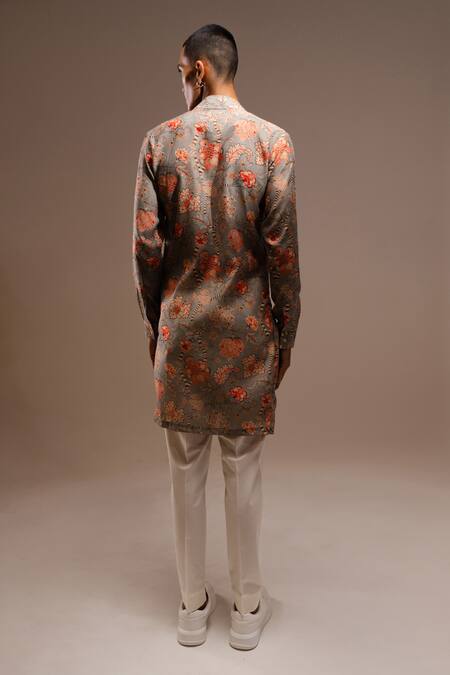 Grey kurta featuring floral print with crochet lace detail from collar down on one side and an asymmetric hemline. Paired with a plain ivory pant.