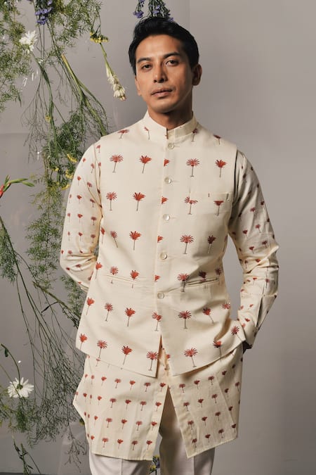 Multi color bundi featuring an all-over palm print with bead embroidered highlights