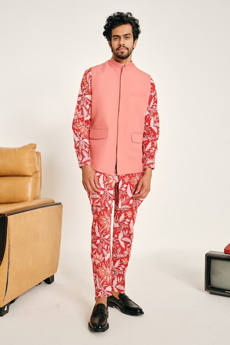 Pale salmon cotton linen bundi with patch, flap pockets & mandarin collar.