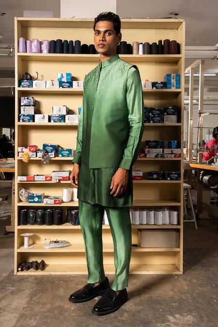 Green Linen, Satin Beads, Crystals, Stones Ombre Embroidered Bundi And Kurta Set