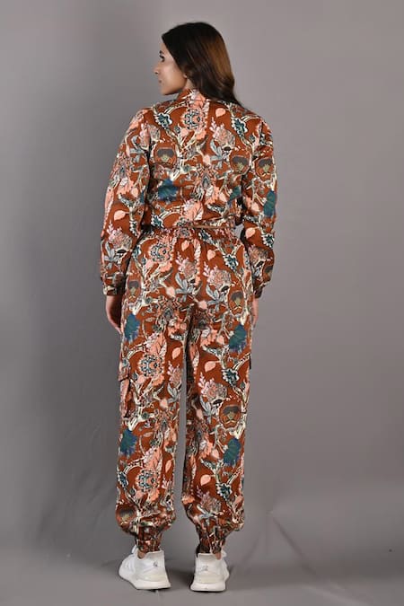 Maroon cotton satin bomber jacket with multi color floral print & dress flap patch pockets. Paired with printed jogger pants with side & patch pockets.