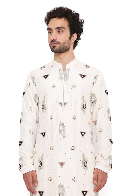 Off white abla silk embroidered bomber kurta featuring a front zipper. Paired with abla silk jogger pant.