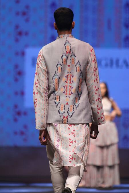 Grey dupion silk bundi with ikat carpet print & patch pocket. Paired with printed cream kurta & off white cotton silk churidar.