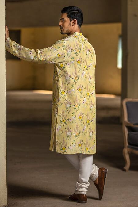 Lemon silk kurta with garden print & mandarin collar. Paired with off white cotton silk churidar.