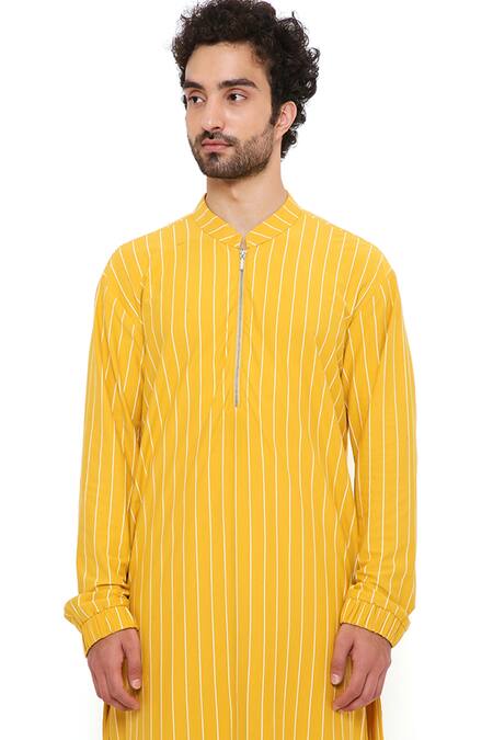 Mustard striped kurta featuring a front zipper and mandarin neckline. Paired with matching striped jogger pants with cuffed hems.