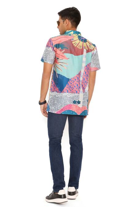 Purple shirt featuring a tropical print design in silk mulmul fabric