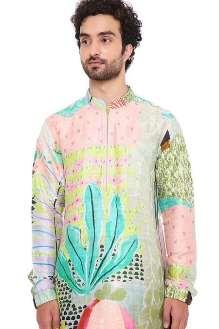 Green kurta with tropical print & mandarin collared neckline. Paired with jogger pant.